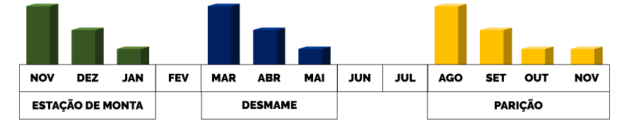Como a estação de monta cobre o período de outubro a janeiro, a estação de parição é prevista para acontecer entre agosto e novembro; portanto, a estação de desmame ocorre entre março, abril e maio do ano seguinte.