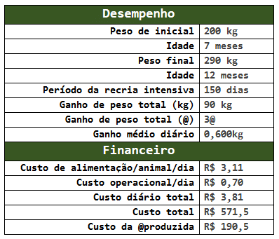 Para calcular o custo diário total (alimentação + operação), o custo total (diário x dias de recria intensiva) e o custo da arroba produzida (total de arrobas produzidas), veja o exemplo abaixo.